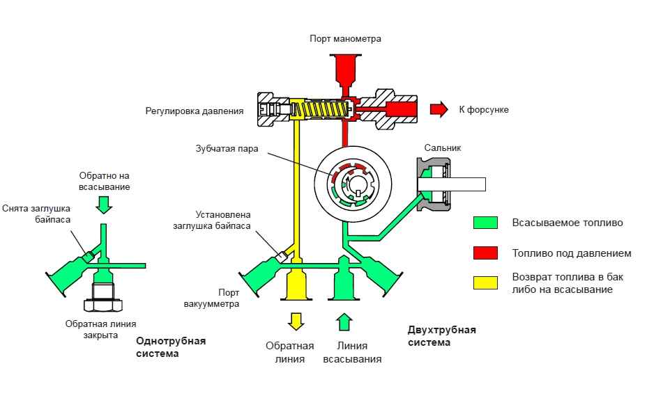 Запирает поток. При пуске двигателя насос начинает раскручиваться, однако пока скорость работы шестерен невысока, всё топливо уходит «в обход» через специальную полость. Как только насос выходит на рабочие обороты, эта полость перекрывается, и давление быстро возрастает – клапан открывается для подачи топлива в форсунку. При остановке системы происходит обратный процесс: давление падает, клапан закрывается.
