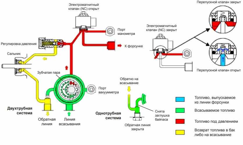 В двухтрубной системе в обратную линию должна быть установлена заглушка байпаса, чтобы топливо, слитое регулировочным клапаном, было возвращено в емкость, а поток линии всасывания был равен мощности зубчатой пары.
