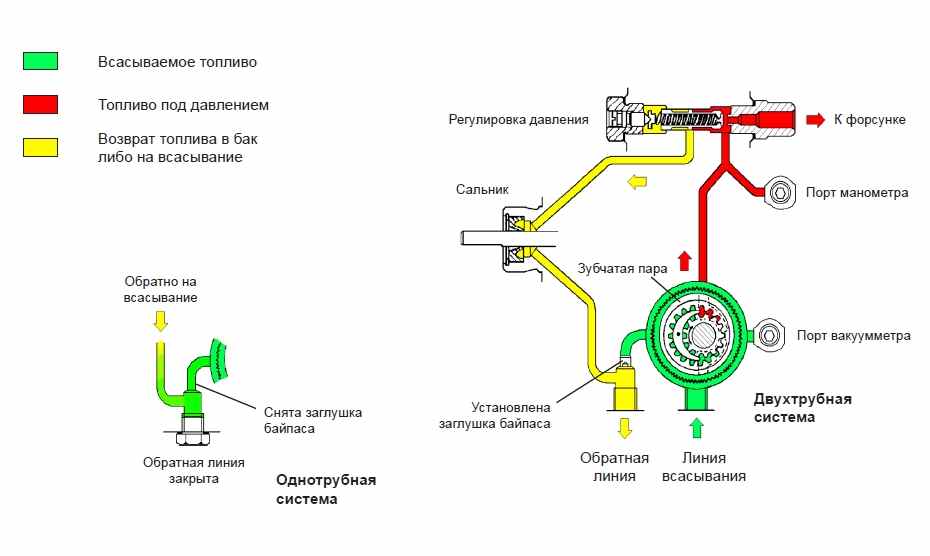 Зубчатая пара всасывает топливо из емкости через встроенный фильтр, затем перекачивает его к клапану, регулирующему давление топлива, и далее к форсуночной линии. Топливо, не прошедшее через линию форсунки, сливается через клапан в обратную линию при двухтрубной системе, при однотрубной системе – возвращается на всасывание. В таком случае с обратной линии должна быть снята заглушка байпаса, и обратная линия закрывается стальной заглушкой с шайбой.
