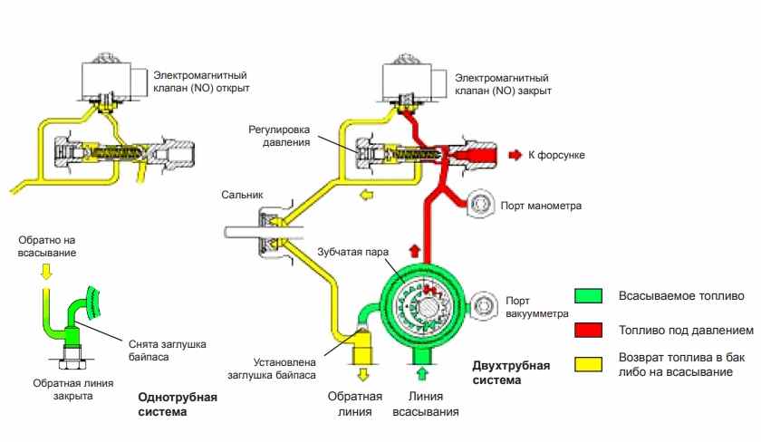 Зубчатая пара всасывает топливо из емкости через встроенный фильтр, затем перекачивает его к клапану, регулирующему давление топлива, и далее к форсуночной линии. Топливо, не прошедшее через линию форсунки, сливается через клапан в обратную линию при двухтрубной системе; при однотрубной системе - возвращается на всасывание. В таком случае с обратной линии должна быть снята заглушка байпаса, и обратная линия закрывается стальной заглушкой с шайбой.