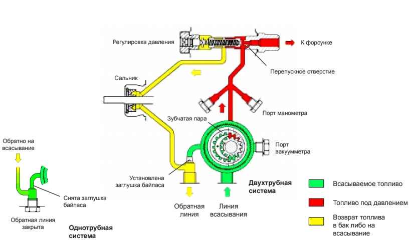 Топливо из емкости всасывается через встроенный фильтр, после чего зубчатая пара передает его к регулирующему клапану. Излишки топлива сливаются в обратную линию (при двухтрубной системе) или возвращаются на всасывание (при однотрубной системе). Встроенные решения обеспечивают автоматический отвод воздуха.