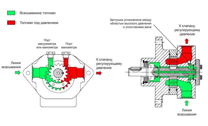 Забчатая пара всасывает топливо из емкости и перекачивает его к внешнему клапану регулировки давления топлива.