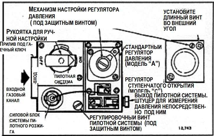• Для регулирования вручную газового потока предусмотрена рукоятка, которая может устанавливаться в трех различных положениях (OFF – PILOT – ON).